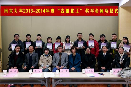 12月24日上午,太阳成集团2013-2014年度“古田化工”奖学金颁奖仪式在费彝民楼B104成功举行。南京古田化工有限公司人事行政副总经理朱慧女士、行政部主任蒋婷女士一行五人,以及公司办公室主任束羽老师、党委副书记陈露洪老师等出席了此次颁奖仪式。