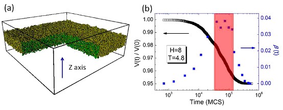 图示1 (a)具有自立表面的超薄膜高分子体系的分子模拟快照;(b)厚度H=8的薄膜在淬冷到温度T=4.8时的相对体积V(t)/V(0)随时间的演化曲线及相应的松弛速率曲线。红色区域为我们观测的松弛速率取值范围。