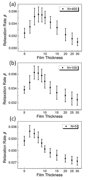 图示2 淬冷到T=4.8时不同链长高分子薄膜的结构松弛速率随膜厚的变化曲线。(a)链长400个链单元;(b)链长100个链单元;(c)链长5个链单元。