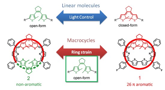 典型的卟啉是具有18个π电子的芳香性大环分子,2012年,该课题组首次将新型的构筑单元噻吩吡咯引入到卟啉体系,得到了首例室温下稳定存在的具有20 π电子、非芳香性的杂环卟啉(Angew. Chem. Int. Ed. 2012, 51, 12801.)。该成果开辟了一种通过引入新型有机构筑单元来调控杂环卟啉的电子结构的思路。最近,他们选用对光照、氧化还原环境的改变有响应的有机构筑单元二噻吩乙烯,将其引入到卟啉体系中,成功地合成一个含闭环二噻吩乙烯结构和另一个同时含有闭环和开环二噻吩乙烯结构的扩环卟啉(图2,化合物1和2)。化合物1被证明是具有26-π 电子的芳香性分子,因为其在溶液状态下表现出共轭芳香卟啉分子所特有的紫外吸收和MCD(磁圆二色谱)光谱,核磁共振及ACID(感应电流的各向异性)理论计算同时验证了环电流的存在。而化合物2则因为开环结构的存在,π电子路径被断开而表现出了明显的非芳香性。这种设计实现了利用构筑单元结构的变化来调控卟啉大环分子的π电子结构及芳香性的目的。该成果发表于Angew. Chem. Int. Ed. (2014, DOI:10.1002/anie.201402711),其中论文的第一作者为博士生周志宽。