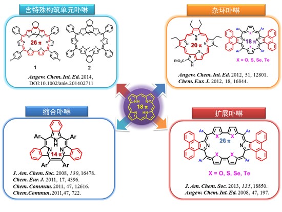 卟啉及其衍生物在自然界的各种生命活动中有着举足轻重的作用。它们广泛存在于生物体内和能量转移紧密关联的重要组织器官中,例如动物体内的血红素(铁卟啉)和血蓝素(铜卟啉)、植物体内的维生素B12(钴卟啉)和叶绿素(镁卟啉)等天然卟啉化合物在氧的传递、光合作用、电子传输和能量产生等生命活动中具有关键的作用。同时由于具有很高的稳定性和优异的光电性质,使得它们不仅在生物活性模拟、催化、医药等技术领域广泛应用,而且在分子材料与分子器件、太阳能利用、光动力治疗、分子电子学器件、光存储与显示等诸多高新技术领域日益显现出极为诱人的应用前景。太阳集团tcy8722、配位化学国家重点实验室沈珍教授课题组长期致力于卟啉及其衍生物的结构修饰及应用研究,通过对卟啉环的中心、外围以及组成大环的吡咯环的个数等方面进行修饰,获得了一系列结构新颖、具有特殊光物理性质的新型卟啉衍生物,结合理论计算和MCD(磁圆二色谱)对卟啉的结构和光谱性质的构效关系进行了分析研究,探索了这类分子在近红外离子探针和光动力治疗领域的应用,图1为该课题组近年来在卟啉研究领域取得的代表性成果。