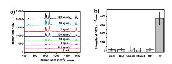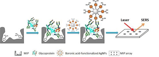 糖蛋白是最常见的蛋白质类型,在生物体中具有多种重要的作用和功能。此外,糖蛋白具有重要的临床诊断价值,目前用于疾病诊断的蛋白质疾病标志物大多为糖蛋白。由于具有重要生理意义或诊断价值的糖蛋白的表达丰度极低,对复杂样品体系中糖蛋白的专一识别和灵敏检测是重要的挑战性课题。免疫分析是临床诊断等许多领域中的重要研究工具,但存在着明显的缺点,如高专一性抗体不易获得、酶和抗体等生物试剂的稳定性差、化学标记试剂对健康有害和对样品环境敏感等。分子印迹(Molecular imprinting)是制备具有类似抗体专一识别性能的仿生识别材料的重要技术。刘震教授研究组近年在分子印迹领域连续取得进展,建立了普适高效的硼亲和分子印迹法,制备出性能先进的分子印迹聚合物,并将其替代免疫分析中的一抗,成功应用于疾病标志物糖蛋白的检测(Angew. Chem. Int. Ed. 2013, 52, 7451-7454; Chem. Sci. 2014, 5, 1135-1140; Anal. Chem. 2014, 86, 959-966)。该研究组近期进一步将分子印迹技术与表面增强拉曼散射(SERS)相结合,发展出免抗体、免酶的高专一性、高灵敏度糖蛋白检测方法—硼亲和夹心法。表面增强拉曼散射具有高灵敏度、无需有毒有害试剂和对样品环境不敏感等优点。该方法利用硼亲和分子印迹聚合物与硼亲和表面增强拉曼散射探针对目标糖蛋白进行双重识别以保证分析的专一性,同时利用表面增强拉曼散射提供高灵敏检测。该方法成功应用于人血清肝癌标志物甲胎蛋白的检测,克服了常规免疫分析的缺点,且具有成本低、稳定性和分析速度快等优点。该方法为普适性方法,可适用于各种糖蛋白。此外,若与手持式或便携式拉曼光谱仪联用,可应用于床旁检测和现场检测。该方法在临床诊断、兴奋剂检测和质量控制等领域具有重要应用前景。该工作7月28日在线发表于Angew. Chem. Int. Ed. 2014, DOI: 10.1002/anie.201405525。该论文第一作者为硕士生叶金。该工作得到国家自然科学基金面上项目和国家重大科学研究计划等基金的经费支持。