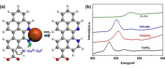 图1. 铜离子活性中心在氮掺杂石墨烯和金属铜结构中的能量状态。