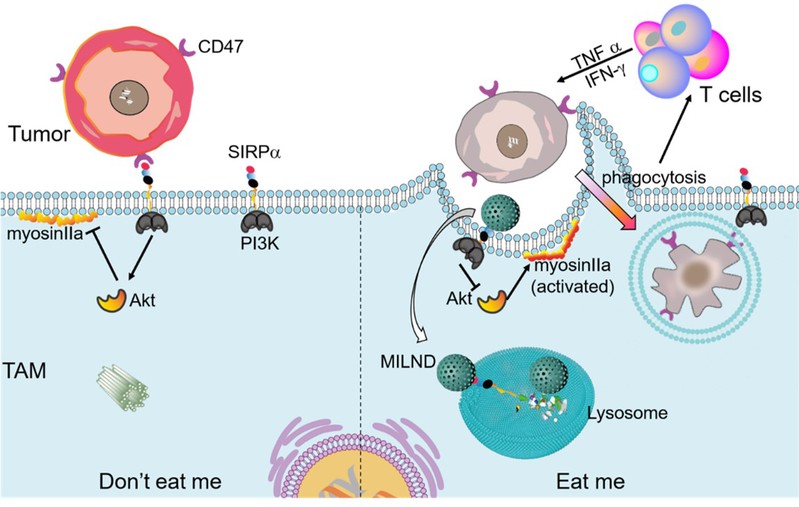 另一方面,鉴于CD47/SIRPα免疫检查点在巨噬细胞介导的“别吃我”信号通路中发挥的重要作用,课题组利用可控印迹包覆策略,以SIRPα N-端表位为靶标,制备一种巨噬细胞靶向分子印迹溶酶体降解剂用于抗肿瘤免疫治疗(图2)。制备的MILND原位特异性识别肿瘤相关巨噬细胞表面的SIRPα。随后,MILND-SIRPα复合物以胞吞方式转移至溶酶体降解,激活PI3K/Akt信号通路,最终触发巨噬细胞介导的抗肿瘤免疫应答。此外,吞噬细胞呈递的肿瘤抗原也有效促进T细胞活化及其介导的肿瘤杀伤。这一研究成果近期发表在Nano Today杂志上。公司21级博士生韩延杰为文章的第一作者,刘震教授为文章的通讯作者。