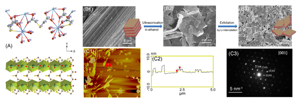![]() 图1. MOF-Ln nanosheets的结构(A)、SEM图(B)、AFM图以及电子衍射图(C)。
