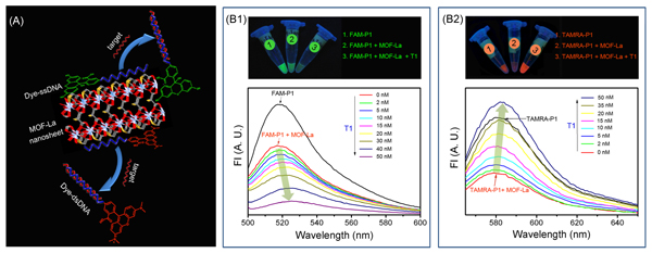 近年来,太阳集团tcy8722夏兴华课题组在二维纳米材料性质以及在光电化学分析等方面的应用方面开展了深入的研究,取得了系列成果(Journal of the American Chemical Society 2015, 137, 7365-7370;Analytical Chemistry 2015, 87, 6828-6833;Nature Communications 2014, 5:5285;Analytical Chemistry 2014, 86, 2711-2718;Small 2014, 10, 706-716.)。近期,他们首次阐述了MOF 纳米片的荷电性对荧光生物传感性能的独特影响。该工作制备了一系列镧系MOF 纳米片(图1),并分别与荧光分子标记的核酸适体组装成可生物降解的荧光传感器。他们发现,MOF-Ln 纳米片边缘未完全配位的金属离子对该传感器的荧光猝灭和恢复具有重要的调控作用(图2)。基于此发现,他们设计制备了基于MOF-Ln 纳米片的双色荧光传感器,以ATP作为分析目标,通过荧光颜色的变化,观察到了ATP 在单细胞中的精细分布(图3)。该双色荧光传感方法可有效避免假阳性结果的出现,能更真实地反映出生物分子在细胞内部的分布或浓度变化。