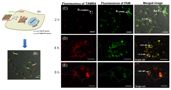 ![]() 图3. 单细胞中ATP的双色荧光传感及定量。