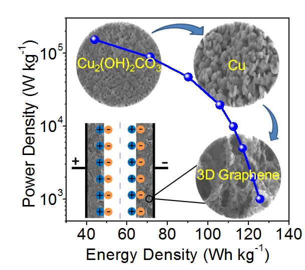近年来胡征教授课题组发展了一种原位氧化镁模板法制备碳基纳米笼的新方法,所得纳米笼呈新颖的分级结构,具有比表面积大、微孔-介孔-大孔共存、导电性优良、浸润性可调等特点,表现出优异的EDLC性能[Adv. Mater. 24(2012)347;27(2015)3541.]。最近,鉴于金属基底上沉积的碳材料的电导率通常优于氧化物基底上沉积的碳材料这一现象,他们将原位氧化镁模板法拓展为原位多孔纳米铜模板法,以聚甲基丙烯酸甲酯(PMMA)为固态碳源,得到了一种新型的多孔三维寡层类石墨烯材料(3DG),具有微孔-介孔-大孔相互连通的开放性孔结构,比表面积大(>1500 m2 g−1),导电性高(>800 S m−1),在水系和离子液体中均有良好浸润性。这种3DG材料在水系和离子液体电解液EDLC中的功率密度分别高达1066.2 和 740.8 kW kg−1,其能量密度、循环稳定性均处于EDLC的先进水平,展示出在超高功率和高能量密度存储领域的广阔应用前景。更令人感兴趣的是,他们通过系统考察EDLC的等效串联电阻(即计时电位曲线的IR压降)随电流密度的变化规律,从一个新的视角深入理解了EDLC材料的结构与性能关系,与经典电化学交流阻抗谱的研究结果相互印证,互为补充,这为深入理解电化学能量存储材料的构效关系提供了新的思路。