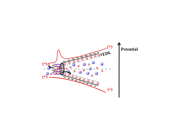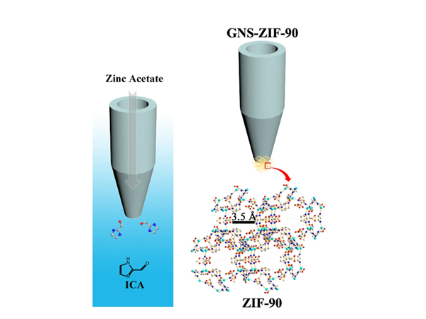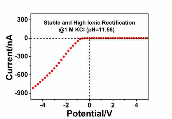 沸石咪唑酯骨架材料(ZIFs)是金属有机骨架材料(MOFs)的一类,由有机咪唑酯配体与过渡金属离子交联形成,含有有序的亚纳米孔道结构。MOFs具有较好的稳定性和较大的比表面积,已被广泛应用于气体选择性捕获、能源存储与转化、有机催化以及污染物降解等领域,但鲜有直接针对物质与ZIF亚纳米孔道的相互作用及物质在这些亚纳米同道中的传输行为等基本问题的研究。最近,陈洪渊教授研究团队夏兴华、王康课题组将ZIF-90材料原位组装在玻璃纳米管的尖端,构建了无裂痕亚纳米孔道体系,探索了该亚纳米通道中非对称质荷传输的特殊行为。研究发现,当溶液pH值为较强碱性时,由于咪唑环的去质子化作用,离子与ZIF孔道间会发生强烈的静电作用,使ZIF孔道两端形成差异化的离子迁移现象,在离子迁移电流上显现出明显的整流效应。即使在碱性高浓度的KCl溶液中,整流比高达500以上,这是高浓度盐溶液下能获得如此显著整流效应的首次报道。此外,该研究还用荧光和电化学方法观察到尺寸大于ZIF-90孔道(直径0.35 nm)的罗丹明B分子引起的整流反转等特性。此项研究促进了对离子穿过亚纳米孔道基本行为及调控因素的认识,有助于MOF作为纳米孔道结构的应用。