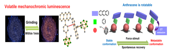 燕红课题组首先关注力致变色材料,因其对外界力的刺激做出响应可用在压力传感、光学信息存储等领。通常该性质用于非易失性存储器,然而固态下较强的分子间相互作用导致易失性存储器难以实现。该课题组将碳硼烷基元引入到蒽发光团形成“D-p-A”构型发光分子,实现了此类自修复力致变色材料(Chem. Commun. DOI: 10.1039/c6cc07093k)。研究发现碳硼烷的存在使得化合物可以通过力调控固态分子内电荷转移实现力致变色响应,该响应还可在1分钟内完成自修复恢复到原始状态(图1),具有易失性存储器需要的性能,显示出潜在应用前景。
