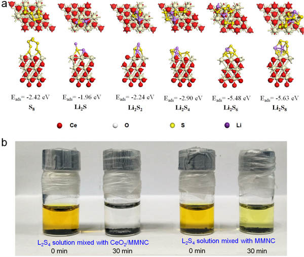 ![]() 图2. (a) 理论模拟CeO2与多硫化锂以及单质硫的吸附作用;(b)CeO2/MMNC与MMNC材料在Li2S4溶液(DME/DOL)中的实际吸附性能测试。