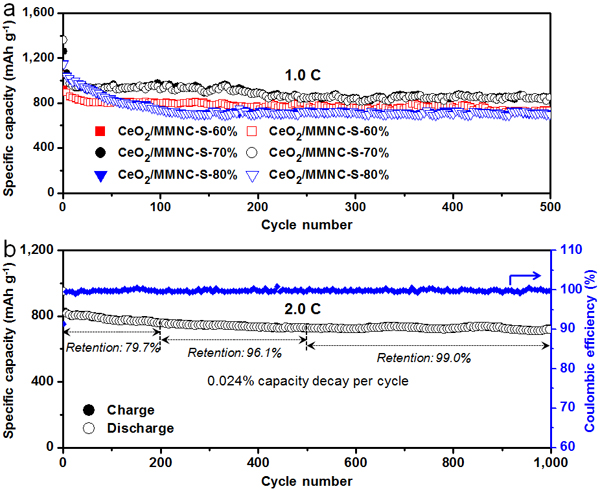 ![]() 图4. 基于CeO2/MMNC-S复合正极的锂硫电池高电流密度下的长循环稳定性测试。(a) CeO2/MMNC-S复合正极在1.0 C电流密度下的循环性能;(b) CeO2/MMNC-S-70%复合正极在2.0 C电流密度下的循环性能。