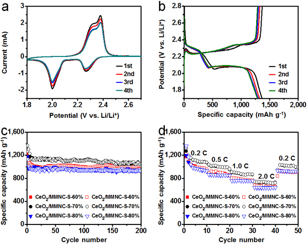 ![]() 图3. 基于CeO2/MMNC-S复合正极的锂硫电池的电化学性能。(a) CeO2/MMNC-S-70%复合正极的循环伏安曲线;(b) CeO2/MMNC-S-70%复合正极的充放电曲线;(c) CeO2/MMNC-S复合正极在0.2C电流密度下的循环性能;(d) CeO2/MMNC-S复合正极的倍率性能。
