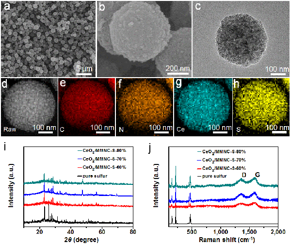 ![]() 图1. CeO2/MMNC-S-70%复合物的(a,b) SEM、(c) TEM表征和(d-h)元素分布图;(i) CeO2/MMNC-S复合物以及单质硫的(i) XRD与(j) Raman表征。