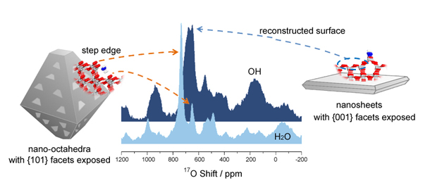 该项研究中,在较低温度下将纳米晶样品与H217O进行同位素交换,仅使纳米晶表面的O物种被17O标记。实验发现,表面选择性标记后两种纳米晶的17O核磁共振谱图截然不同,说明不同晶面的表面O物种的化学环境确实有显著差异,能够通过核磁共振谱学区分纳米晶的暴露镜面。研究还通过对比实验谱图和由不同模型计算得到的谱图,提供了以往谱学研究从未提供的细节:在高能的TiO2(001)表面,发生了表面重构以及H2O分子的解离吸附;在较低能量的TiO2(101)表面,存在“台阶”状缺陷位,H2O分子更易在该位置发生分子吸附。