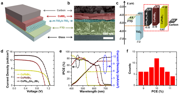 ![]() 图2. 全无机钙钛矿太阳能电池的(a)器件结构和(b)截面SEM图。基于不同CsMX3吸光层的全无机钙钛矿太阳能电池的(c)能带位置图,(d)J-V曲线和(e)IPCE曲线。(f)50个基于CsPb0.9Sn0.1IBr2的全无机钙钛矿太阳能电池的效率统计分布。