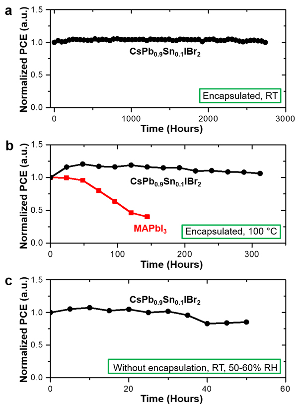 ![]() 图3. 基于CsPb0.9Sn0.1IBr2的全无机钙钛矿太阳能电池的(a)长期稳定性、(b)耐热性和(c)耐湿性。