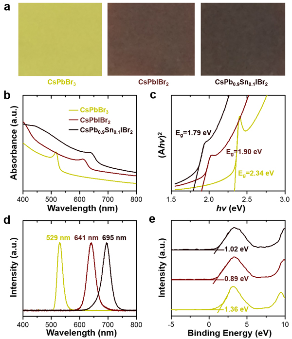 ![]() 图1. 通过能带工程方法,利用Sn2+和I−离子的双掺杂策略,能有效调控CsMX3无机钙钛矿材料的能带结构和光学性质。