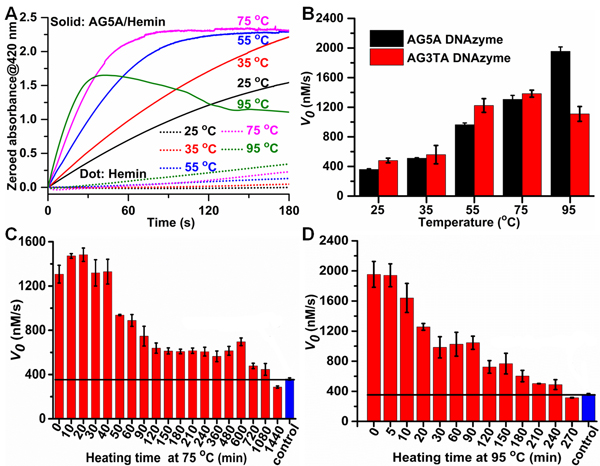 ![]() 图2. 嗜热G-四链体/hemin DNA酶在不同温度下的催化活性及热稳定性研究
