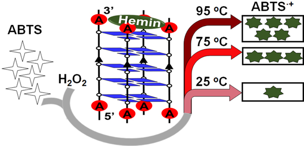 ![]() 图1. 嗜热G-四链体/hemin DNA酶在不同温度下催化底物反应的示意图