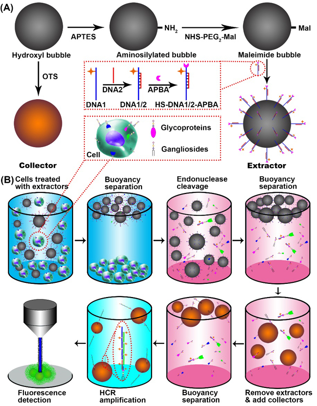 公司生命分析化学国家重点实验室的鞠熀先教授课题组从事细胞表面糖链研究已经十年,在细胞表面糖基的原位检测方法学研究领域提出了奠基性的成果(J. Am. Chem. Soc. 2008, 130, 7224;Angew. Chem. Int. Ed. 2009, 48, 6465; Anal. Chem. 2010, 82, 5804; Anal. Chem. 2012, 84, 1452;Chem. Sci. 2015, 6, 3769)。近两年该研究组发展了特定蛋白质上糖基的多种原位检测方法(Chem. Sci. 2016, 7, 569,Angew. Chem. Int. Ed. 2016, 55, 5220; Angew. Chem. Int. Ed. 2017, 56, 8139)。近期,他们针对神经节苷脂研究的迫切需求,设计了一对具有非破坏性提取和疏水收集功能的浮力微球探针,实现了细胞表面神经节苷脂的定量、亚型筛查与再生分析,于2017年12月4日在线发表(Angew. Chem. Int. Ed. DOI: 10.1002/anie. 201710984)。