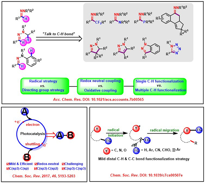最近,公司分子与材料合成研究团队(谢劲课题组、俞寿云课题组和朱成建课题组)受邀在美国化学会旗下刊物Accounts of Chemical Research和英国皇家化学学会旗舰刊物Chemical Society Review在线发表三篇自由基反应的特邀综述论文,具体包括“The Recent Achievements of Redox-Neutral Radical C-C Cross-Coupling Enabled by Visible-Light”(Chem. Soc. Rev. 2017, 46, 5193--5203),“Distal Radical Migration Strategy: An Emerging Synthetic Means”(Chem. Soc. Rev. DOI: 10.1039/c7cs00507e)和“Exploration of C-H Transformations of Aldehyde Hydrazones: Radical Strategies and Beyond”(Acc. Chem. Res. DOI: 10.1021/acs.accounts.7b00565)。三篇论文系统地介绍了该团队在可见光促进的自由基-自由基交叉偶联反应,自由基诱导的远程迁移反应和醛腙的自由基C-H键官能化领域的最新成果。