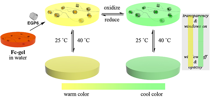 胡晓玉/王乐勇课题组在该研究中,提出一种不同功能的正交一体化策略,将乙二醇修饰的柱[6]芳烃(EGP6)的热响应性与氧化还原诱导的二茂铁/二茂铁鎓离子基团之间暖色与冷色之间可逆转换的性质正交一体化于一个体系中,成功制备了冷/暖色调可转换的温致变色材料。基于EGP6与二茂铁的主-客体作用,他们将二茂铁侧链修饰的聚丙烯酰胺聚合物凝胶(Fc-gel)浸泡在EGP6水溶液中,得到了显著溶胀且高度透明的水凝胶(Fc-gel∙EGP6)。该水凝胶中,因二茂铁基团在氧化还原刺激下能够在橘色和绿色之间可逆转换,使其具有冷/暖色调转换的性能,因此,由该水凝胶制备的智能窗具有改善人们情绪的功能。更重要的是,这种透明的Fc-gel∙EGP6水凝胶不管是在暖色调还是在冷色调下都继承了EGP6优异的温度响应性能,使其成为一种优良的温致变色材料,可以调节太阳辐射能量的进入,营造更加舒适的室内环境。这种冷/暖色调可转换的温致变色智能窗材料成功地为不同性质的正交一体化策略提供了应用实例,同时该策略也为新型功能化材料的开发提供了新的思路。