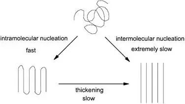 ![]() 图1 链状大分子的分子内链折叠成核模式和分子间缨状微束成核模式