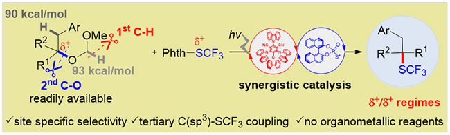 近日,公司分子与材料合成研究团队的谢劲课题组和朱成建课题组在可见光双元协同催化领域取得又一重要进展,首次实现了可见光与有机小分子协同催化的三级烷基醚的三氟甲硫基修饰。该成果“Synergistic Catalysis for the Umpolung Trifluoromethylthiolation of Tertiary Ethers”于2018年6月28日在化学顶级期刊Angewandte Chemie International Edition (DOI:10.1002/anie.201805927) 上在线发表。论文的第一作者是2017级博士研究生徐文涛,谢劲副教授和朱成建教授为该论文的通讯作者。