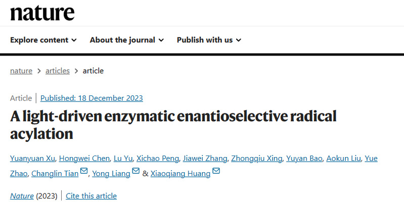 太阳集团tcy8722黄小强特聘研究员,与化院梁勇教授、中国科学技术大学/中国科公司强磁场科学中心田长麟教授合作,开发了焦磷酸硫胺素(ThDP)依赖酶和光催化协同的双催化新体系,该体系是自然界中全新的、现有化学方法难以实现的全新分子生化体系,不仅极大地扩展了酶的催化功能、为绿色生物制造提供了丰富元件,还为化学领域的手性精准控制难题提供了新策略,有望引领光生物制造新方向。成果以“A light-driven enzymatic enantioselective radical acylation”为题,2023年12月18日在线发表于Nature期刊,论文链接:https://www.nature.com/articles/s41586-023-06822-x。