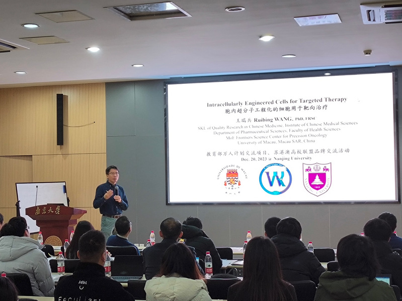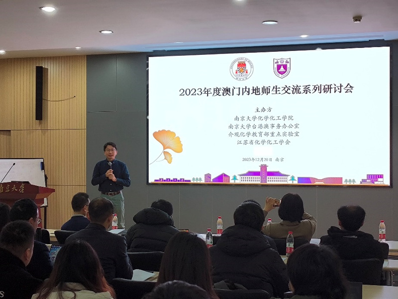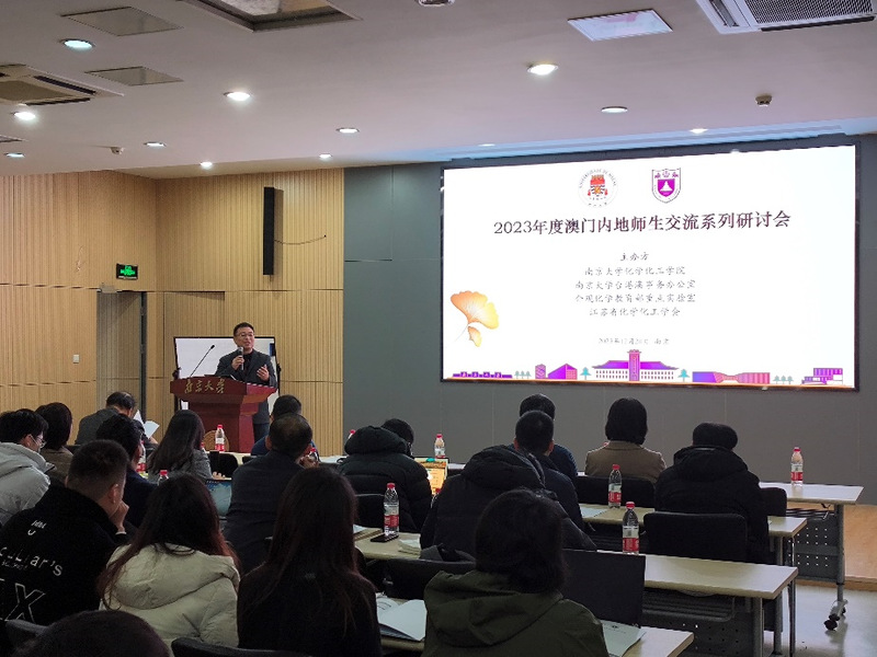 为深化内地与港澳教育交流合作,推动港澳与内地高校师生交流,在教育部港澳台事务办公室“港澳与内地高校师生交流计划项目”支持下,澳门大学(澳大)师生代表团在澳大全球事务部总监王瑞兵教授带领下,利用澳门高校寒假期间,于2023年12月下旬访问相关江苏高校和企业。作为澳大师生代表团访问行程的重要组成部分,2023年12月20日,“2023年度澳门内地师生交流系列研讨会”在太阳集团tcy8722举办。研讨会由太阳集团tcy8722、太阳成集团台港澳事务办公室、介观化学教育部重点实验室、江苏省化学化工学会组装系统化学专业委员会和大环与超分子化学专业委员会合作举办。本次论坛借澳门大学师生访问南京之际,邀请南京师范大学、南京工业大学、南京林业大学、南京理工大学、南京航空航天大学、常州大学、东南大学等师生代表欢聚一堂,共同开展教育与科研讨论。