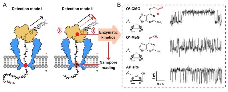 纳米孔测序作为第三代单分子测序技术,具有直接测序核酸的技术优势,在直接表征广泛的核酸序列修饰或损伤方面极具潜力。然而,常规的纳米孔测序分析(图1A, Detection mode I)会产生测序错误,如对于目标修饰碱基的分辨率不足或检测受序列环境干扰而产生错读,以及目标碱基过孔速度太快而造成漏检。