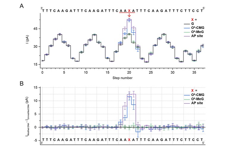 近日,公司黄硕教授课题组在Nano letters上报道了一种新型通过在纳米孔测序中监测聚合酶阻滞动力学的DNA损伤测序方法(图1 A, Detection mode II),利用单分子水平上DNA损伤与聚合酶活性位点间相互作用汇报出的酶阻滞动力学特征,成功实现了三种烷基化试剂诱导形成的致突变性与致癌性DNA碱基损伤O6-羧甲基鸟苷(O6-carboxymethylguanosine,O6-CMG)、O6-甲基鸟苷(O6-methylguanosine,O6-MeG)与无碱基位点(abasic site, AP site)的准确区分(图1B)。并且,该方法也为常规纳米孔测序中出现的测序错误提供了解决方案。