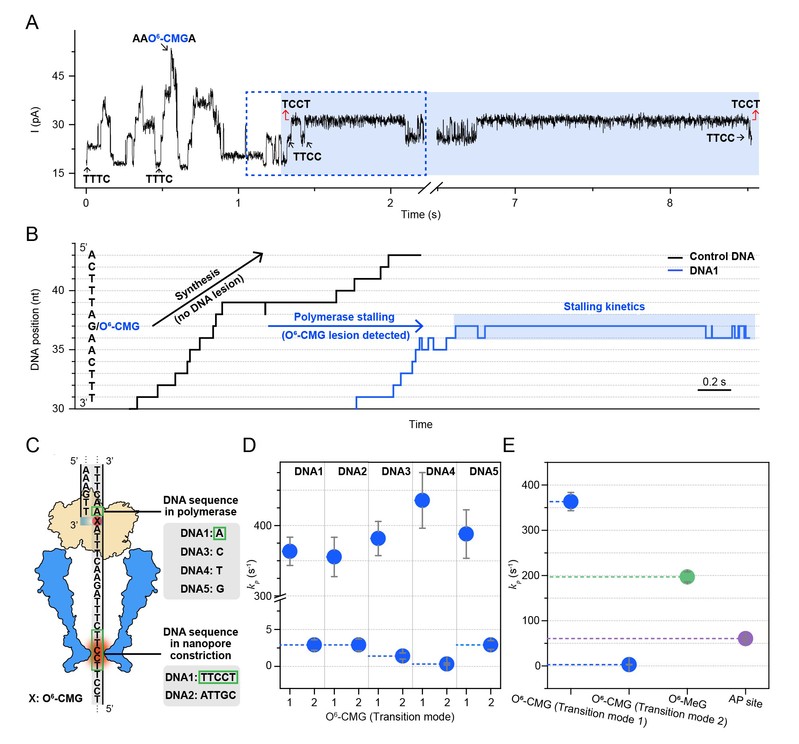 图1. 通过在纳米孔测序中监测聚合酶阻滞动力学区分DNA损伤的概念演示。