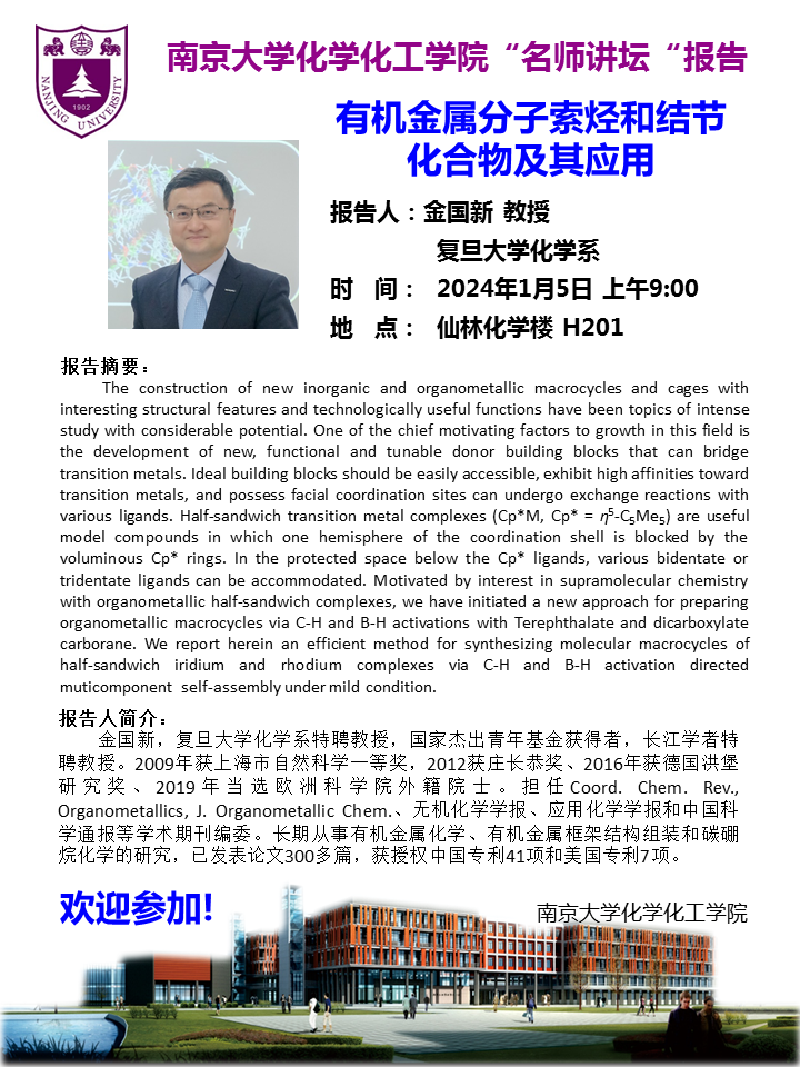 1月5日名师讲坛-金国新教授:有机金属分子索烃和结节化合物及其应用