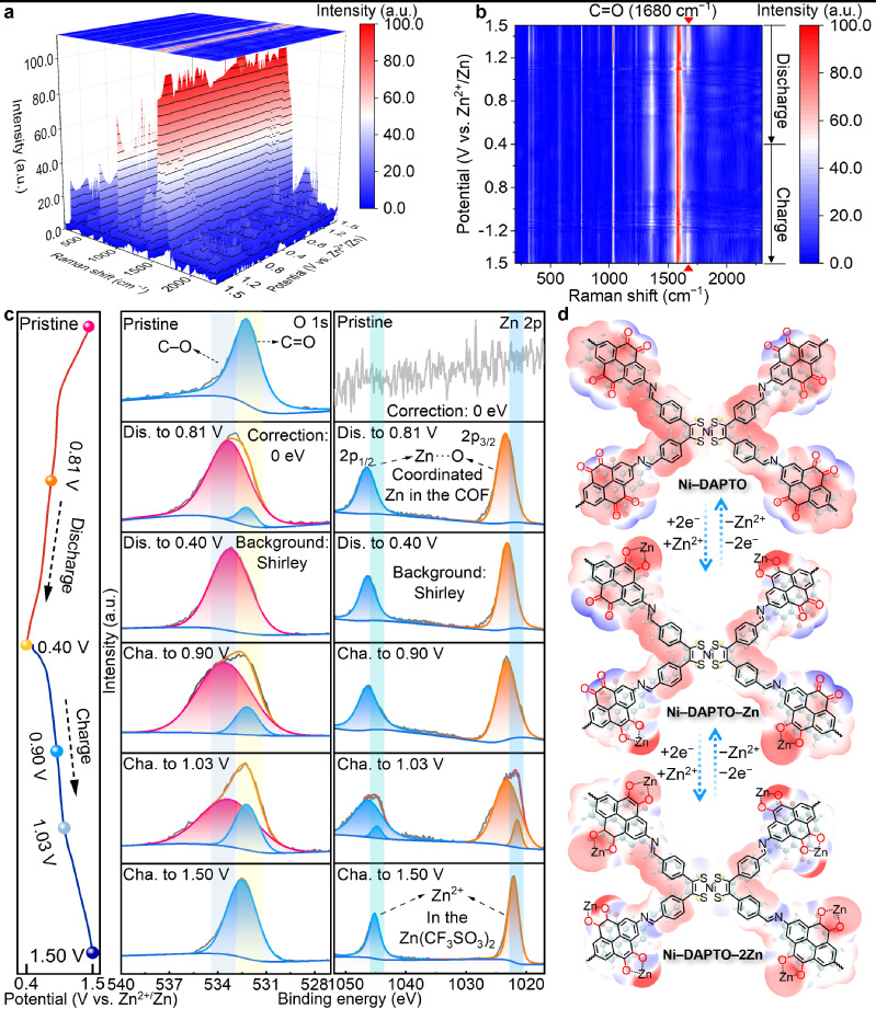 为了验证Ni–DAPTO作为锌离子电池正极的储能机制,原位拉曼和XPS谱图表征了基于C=O活性基团随电位变化的Zn2+存储机理。Ni–DAPTO的分子静电势伴随Zn2+的脱嵌而变化,直观地展现了存储机理。在第一个还原峰对应的过程中,一个Zn2+先与PTO版块其中一侧的两个C=O发生还原反应,随着电位降低,第二个Zn2+继续与PTO版块中剩余一侧的两个C=O发生还原反应。以上表征与理论计算都表明Ni–DAPTOZn2+存储机理为2Zn2+PTO版块上两侧C=O先后发生的嵌入(还原/键合),是一个四电子的可逆过程。