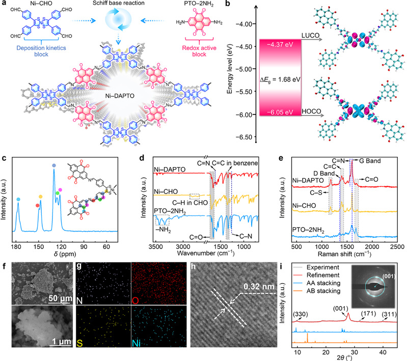 Ni–DAPTO经过醛胺缩聚反应得到。理论计算结果显示在引入Ni配位中心后获得了所期望的低能隙(1.68 eV)。固体核磁、红外、拉曼等光谱表征了Ni–DAPTO的合成。SEMTEM表征了Ni–DAPTO的微观形貌,XRD表征了结晶性。