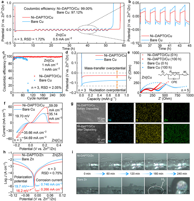 Zn||Cu半电池和Zn||Zn对称电池中对比测试了Ni–DAPTO在负极修饰后与原始集流体和Zn负极之间的性能差异,表明Ni–DAPTOZn2+有良好的沉积引导作用。通过SEM和原位光学直观地观察了Ni–DAPTO作为人工SEI层的Zn枝晶抑制作用。以上都说明了Ni–DAPTO保护层在诱导Zn2+离子均匀沉积和抑制Zn枝晶生长方面发挥了关键作用。这源于Ni–CHO版块中Ni金属位点对Zn2+离子进行的选择性吸附,增强了Zn离子的电荷转移动力学,进而引导Zn离子快速、均匀的沉积。