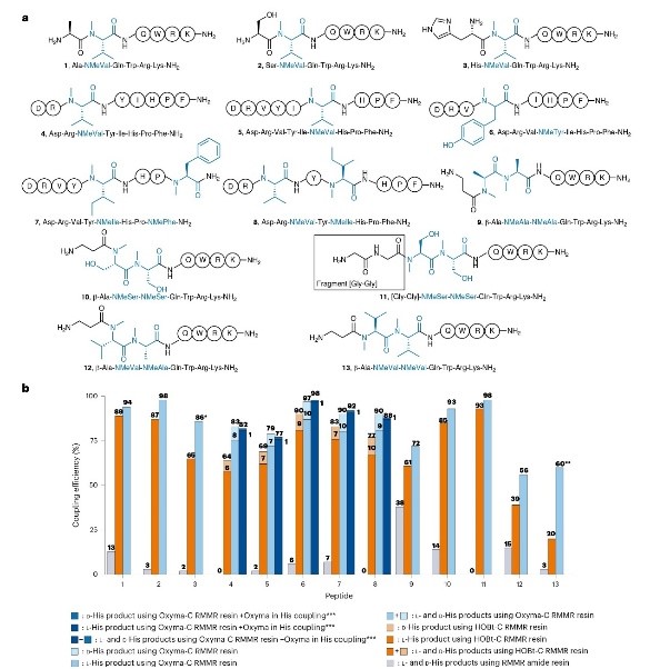 N-甲基化肽的合成:进一步,研究者评估了RMMR树脂在合成含有N-甲基化氨基酸的肽中的表现(图2左侧)。实验结果表明,RMMR树脂在合成含有单个或多个N-甲基化氨基酸的肽时,均表现出显著更高的目标酰胺键形成效率和高达98%的粗产物纯度。特别是对于含有连续N-甲基化氨基酸的肽,RMMR树脂的优势更加明显。例如采用RMMR SPPS的cyclosporin A类似物合成范例显示,含有7个N-Me氨基酸的链状11肽最终粗产品纯度可达88%;经分离纯化,其产率可达70%,大大超越了现有文献报道的所有结果。