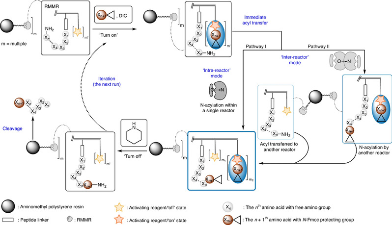 RMMRs的工作机制包括“开启”和“关闭”两个状态(图1)。在“开启”状态下,通过N,N'-二异丙基碳二亚胺(DIC)将投入氨基酸偶联生成多个活性酯,使暴露的N-末端氨基与空间邻近的激活中间体发生快速的O→N酰基转移。随后,通过哌啶处理“关闭”未反应的活性酯,同时去除肽链末端N-Fmoc保护基,为下一轮氨基酸的连接做准备。这种全新的肽键形成机制显著提高了反应物的有效摩尔浓度,并绕过了从溶液到树脂的不利扩散需求,从而实现了高效的N-酰化。