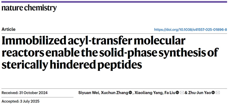 相关研究成果于2025年8月6日以“Immobilized acyl-transfer molecular reactors enable the solid-phase synthesis of sterically hindered peptides”为题发表于Nature Chemistry(Wei, S. (魏思媛); Zhang, X. (张徐纯); Yang, X. (杨晓亮); Liu, F. (刘发); Yao, Z.-J. (姚祝军) Nat. Chem.2025, DOI: 10.1038/s41557-025-01896-8; released online on 6th August 2025)。(Wei, S.; Zhang, X.; Yang, X.; Liu, F.; Yao, Z.-J. Nat. Chem.2025, DOI: 10.1038/s41557-025-01896-8; released online on 6th August 2025)。该项创新技术同时也申请了中国发明专利(CN202410411592X)和国际专利(PCT/CN2025/07126)的知识产权保护。