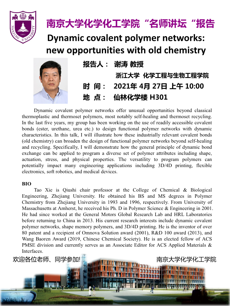 4月27日名师讲坛-谢涛教授:Dynamic covalent polymer networks: new opportunities with old chemistry