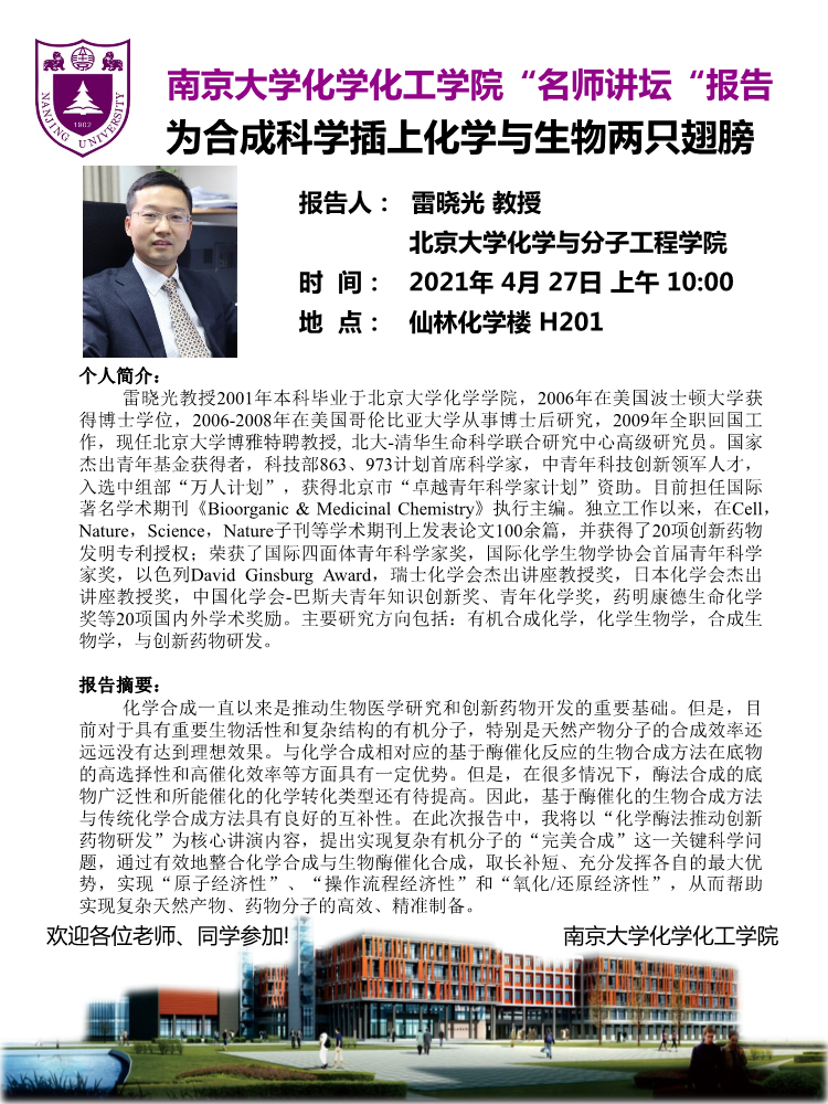 4月27日名师讲坛-雷晓光教授:为合成科学插上化学与生物两只翅膀
