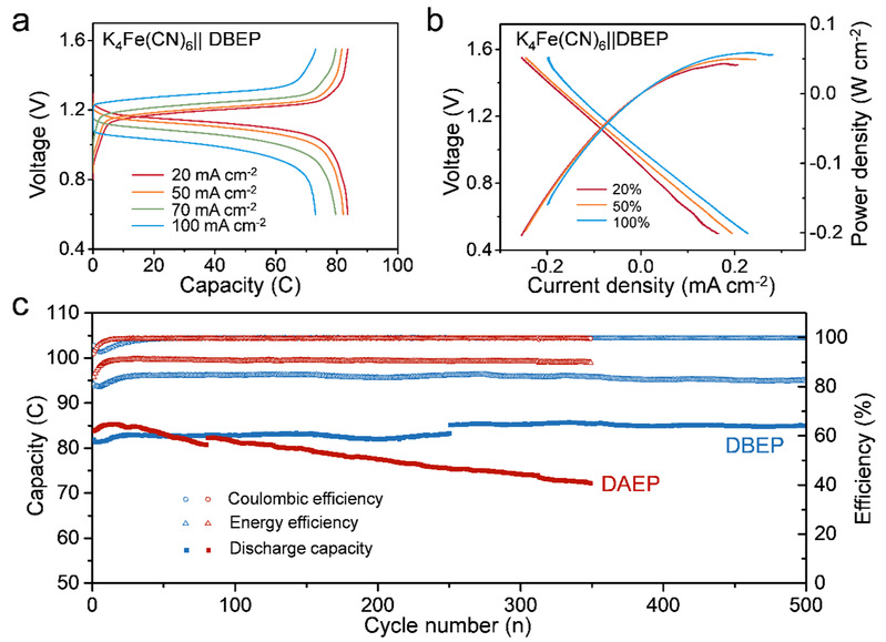 图3.低浓度下ARFB的电化学性能。(a) K4Fe(CN)6|| DBEP ARFB在20、50、70和100 mA cm-2电流密度下的恒流充放电曲线。(b)在20%、50%和100%荷电状态下的极化和功率密度曲线。(c) K4Fe(CN)6||DAEP和K4Fe(CN)6||DBEP ARFB在电流密度为50 mA cm-2下的循环性能