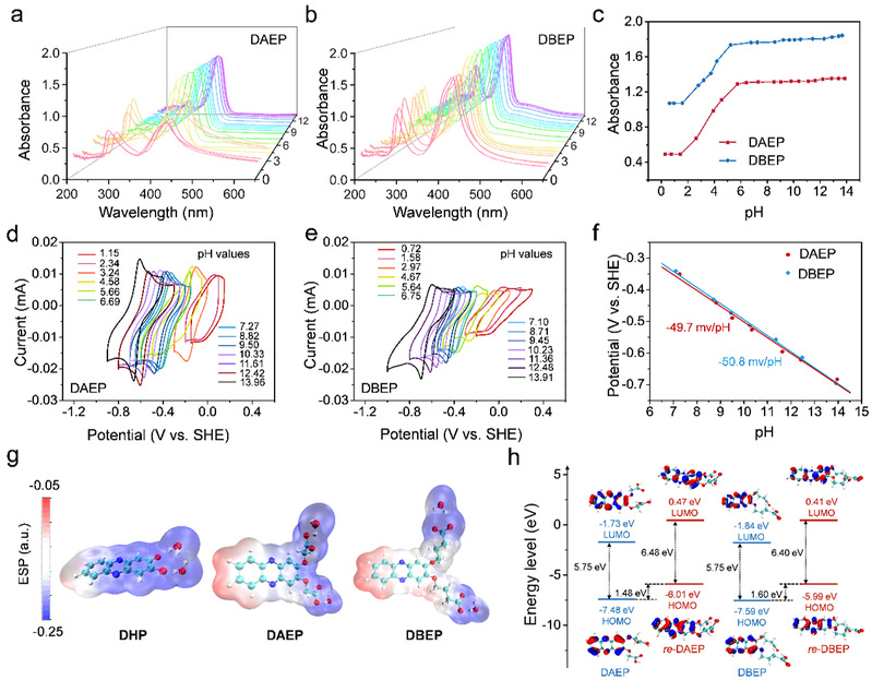 图2.不同pH值下(a) DAEP和(b) DBEP溶液的紫外-可见吸收光谱。(c)在λ382nm处DAEP和DBEP溶液的吸光度与pH值的关系图。(d)不同pH值下DAEP和DBEP的 CV曲线。(f) DAEP和DBEP的pourbaix图。(g) DHP(左)、DAEP(中)和DBEP(右)的优化结构和静电势分布。(h) DAEP和DBEP在氧化态和还原态的分子轨道和能隙。