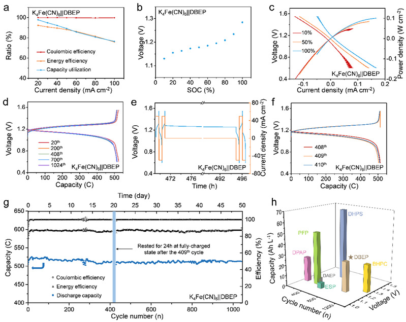 图4. DBEP在高浓度下的电化学性能。(a)不同电流密度下K4Fe(CN)6||DBEP ARFB的库仑效率、能量效率和容量利用率。(b) K4Fe(CN)6||DBEP ARFB的OCV - SOC曲线。(c)10%、50%和100%荷电状态下的极化和功率密度曲线。(d)不同周期的充放电曲线。(e) 100%荷电状态下自放电测试。第408次循环充满电后静置24 h。(f)第408 ~ 410次循环对应的充放电曲线。(g) K4Fe(CN)6||DBEP ARFB在50mA cm−2电流密度下的长循环性能。(h)与先前报道的用于ARFB的吩嗪衍生物的电池性能对比。