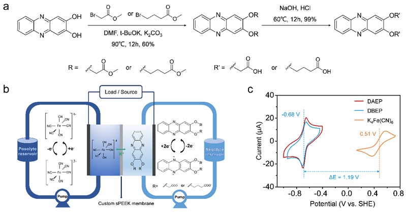 图1. (a) DAEP和DPEP的合成路线。(b)基于DBEP负极电解液、亚铁氰 化 钾正极电解液和sPEEK膜的ARFB结构示意图。(c) 1.0 mM DAEP、DBEP和K4Fe(CN)6在1.0 M KOH溶液中的CV曲线。
