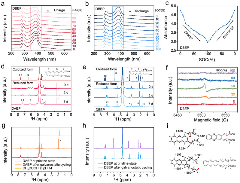 图5. (a, b) DBEP在(a)充电和(b)放电过程中的原位紫外-可见吸收光谱。(c) DBEP在不同soc下的吸光度。(d) 还原态DAEP的氢谱。(e) pH还原态DBEP的氢谱。(f)不同SOCs下DBEP的 EPR谱。(g) 长循环测试后DAEP的氢谱与初始时DAEP的氢谱及CH3COOH的氢谱对比。(h) 长循环测试后DBEP的氢谱与初始时DBEP的氢谱对比。(i) DAEP和DBEP的键长计算。