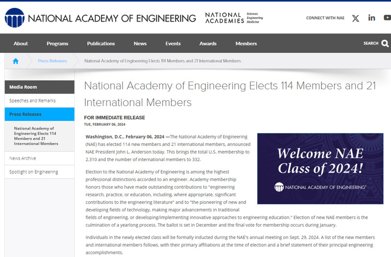当选美国国家工程院院士是工程领域专家的最高专业荣誉之一,以表彰入选者在工程研究、实践、教育等方面做出的重大贡献,在新兴领域技术做出的开拓性工作和传统工程领域中的重大贡献以及在开发/实施工程教育方面的创新贡献。美国工程学界的最高三大奖项均由美国国家工程院评选。现任院士每年选举产生新的院士,每年的新成员投票于12月进行,成员资格的最终投票在1月进行。