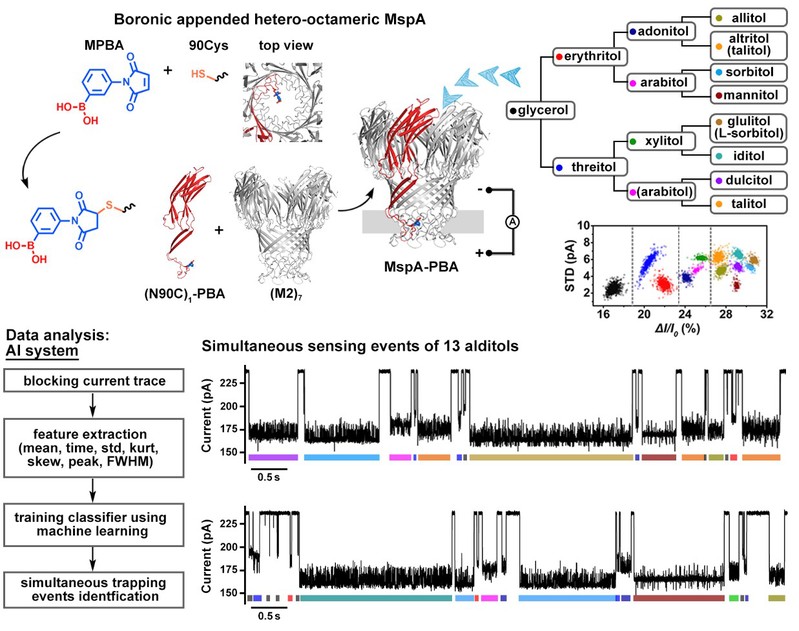 图1. 单个苯硼酸内嵌的MspA-PBA区分由甘油醛衍生出的15种单醛糖被还原所对应的13种糖醇结构